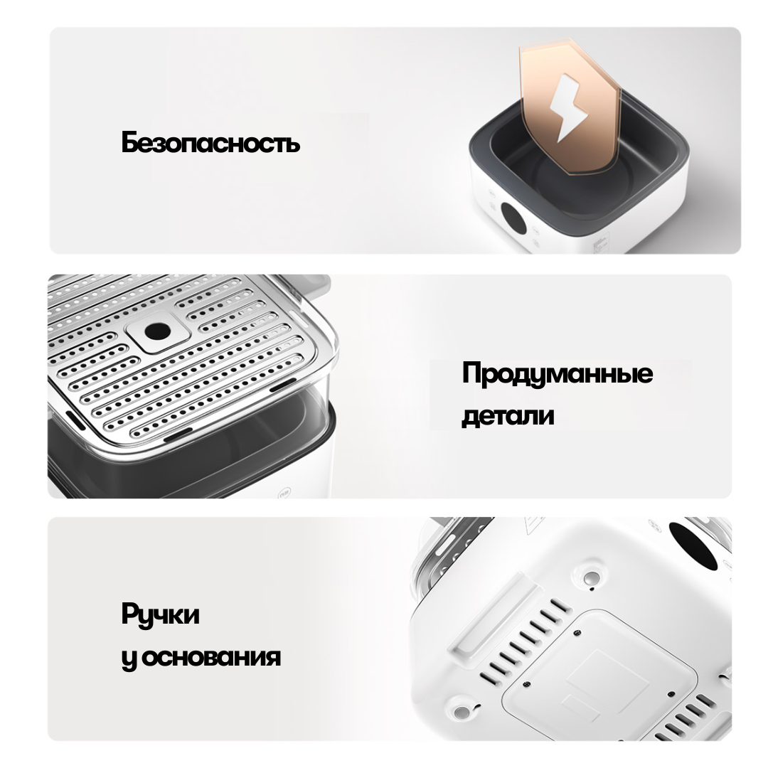 Пароварка предлагает 5 уровней мощности и 8 предустановленных программ для различных рецептов, а сенсорный LED-дисплей и функция отложенного старта упрощают управление процессом приготовления.