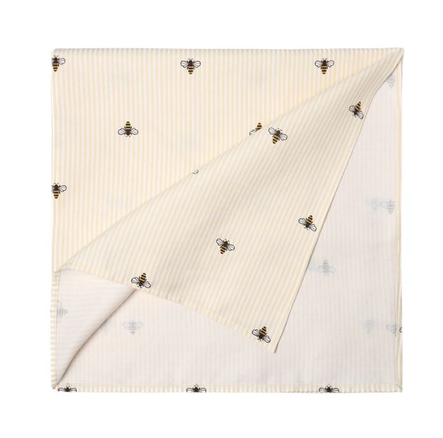 Дизайн: жизнерадостный жёлто-белый рисунок с пчёлами.