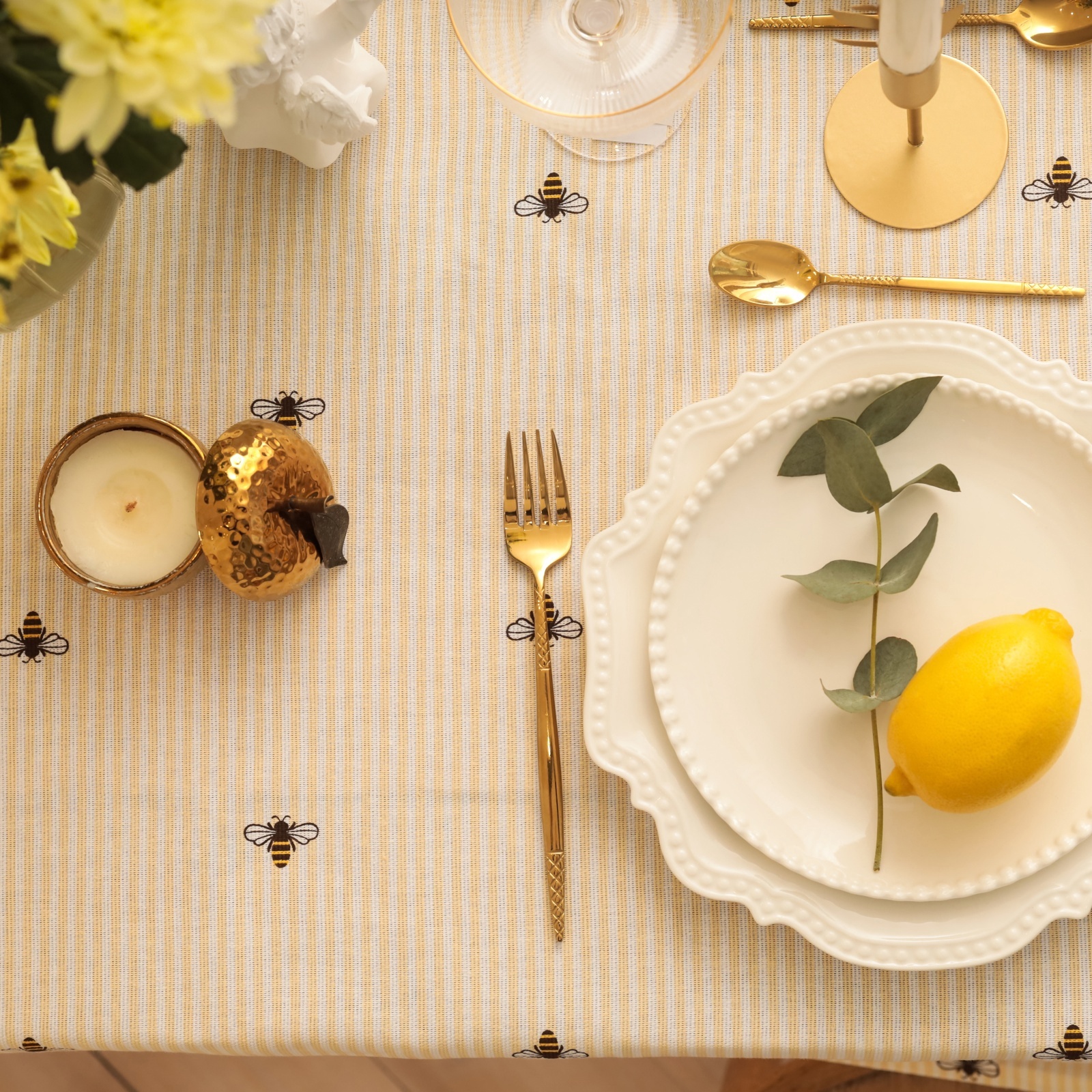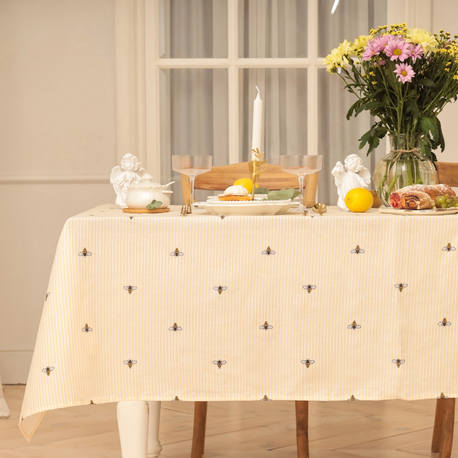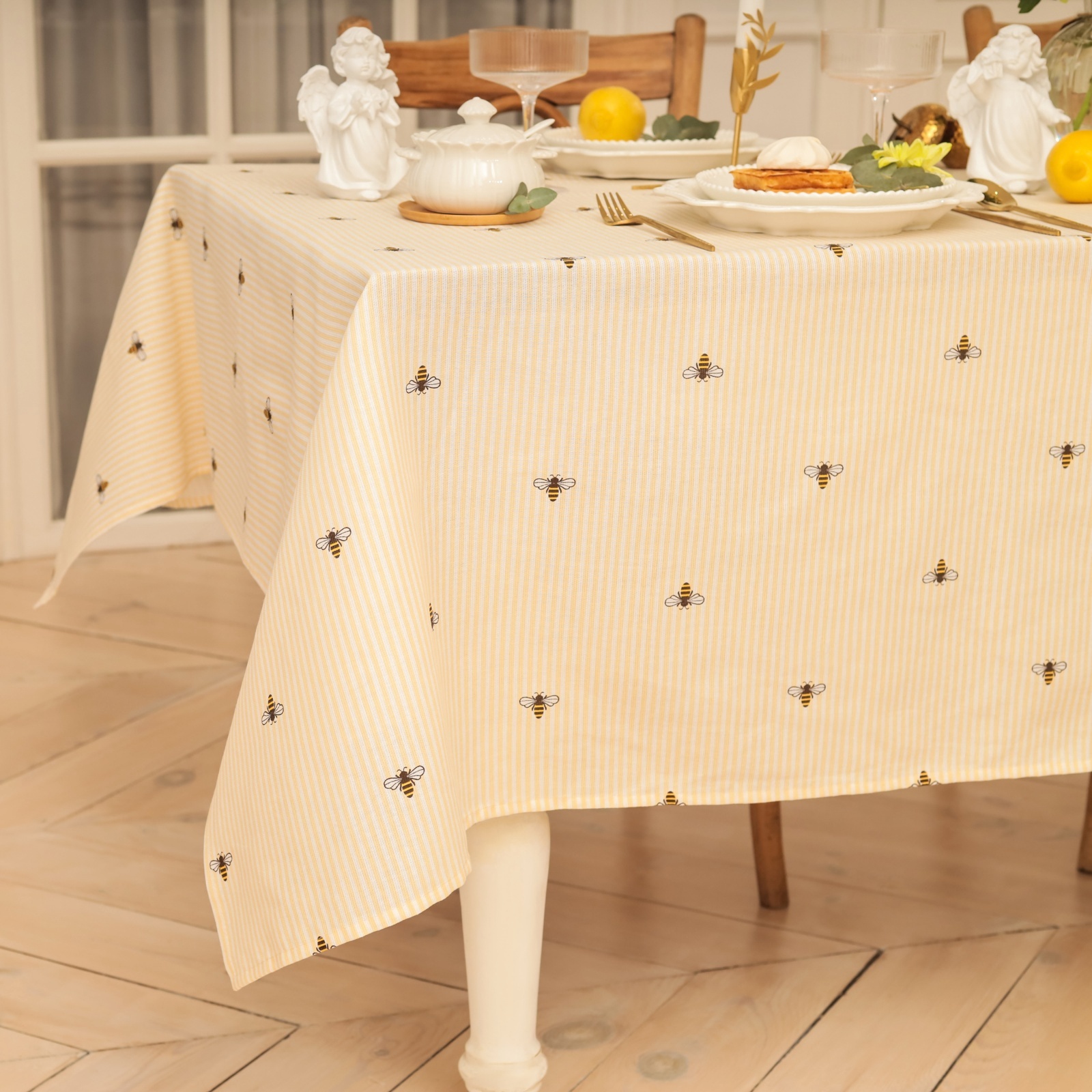 Эта скатерть с пчёлами на жёлтом фоне создаёт на столе атмосферу солнечного летнего дня, даже если за окном идёт снег. Прямоугольный формат 146 на 220 сантиметров подходит для больших обеденных и праздничных столов. Плотная хлопковая рогожка весом 164 г/м² приятна на ощупь и хорошо держит форму, не сползая во время застолья.