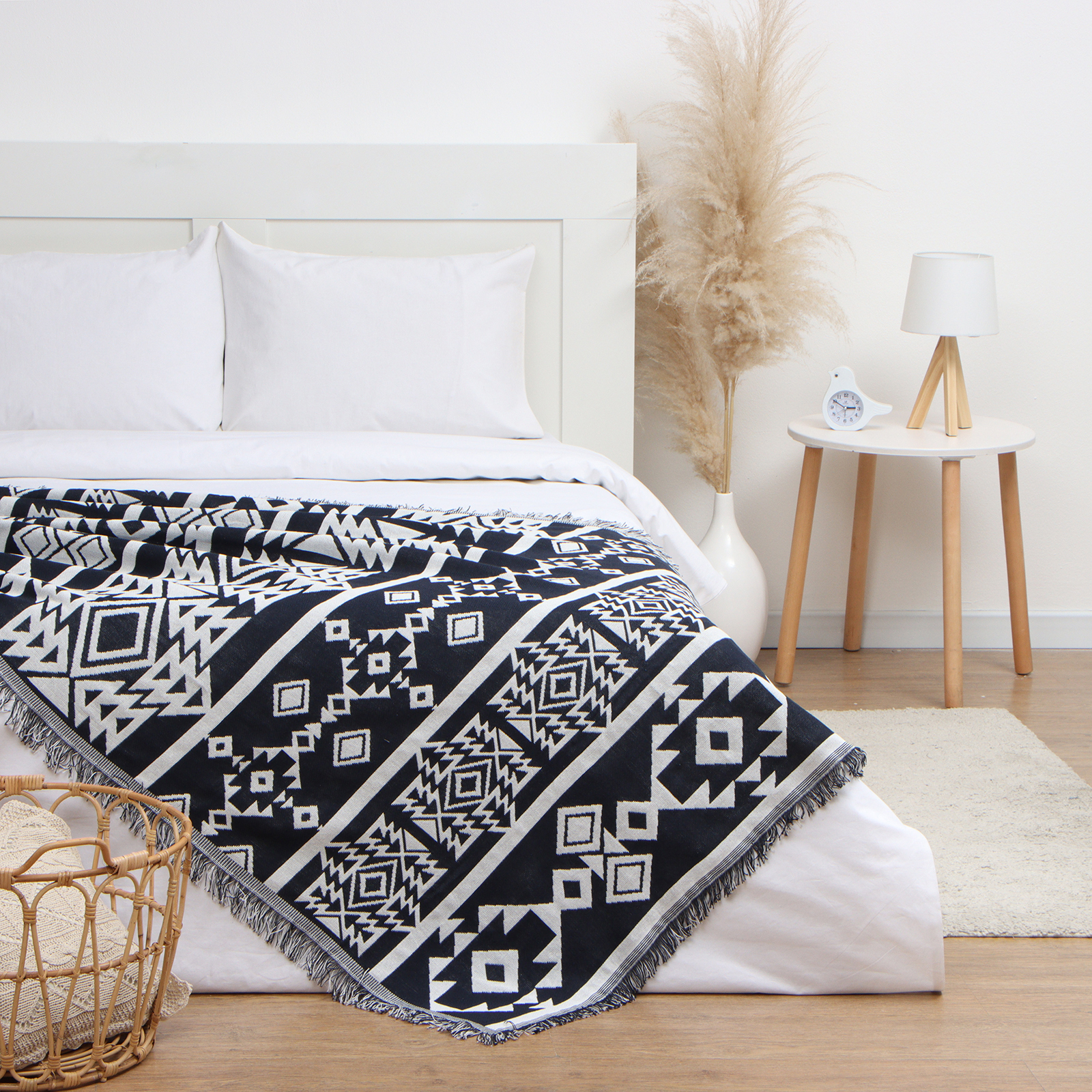 Плед изготовлен из хлопковых нитей с добавлением синтетических, за счет которых, он становится более мягким, прочным, износостойким и устойчивым к усадке