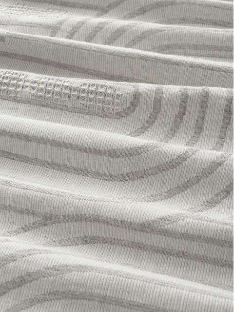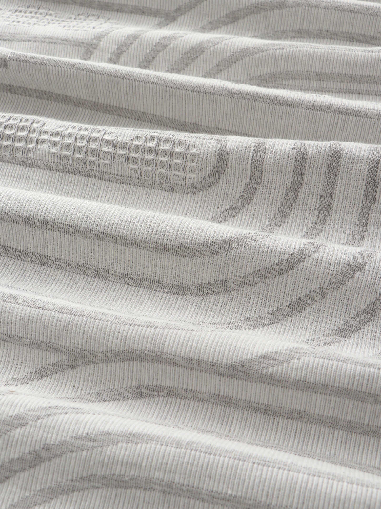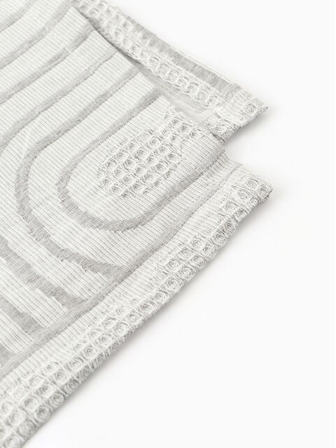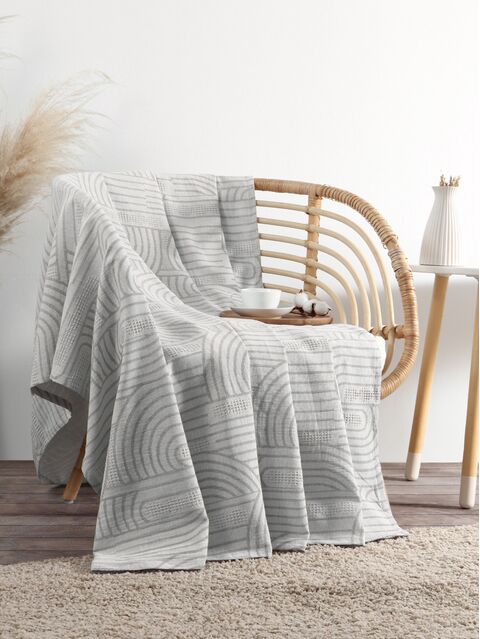 Хлопковый плед серого цвета размером 150×240 см подходит для повседневного использования в спальне или гостиной. Его трикотажная фактура и геометрический узор добавляют текстуру в домашний интерьер, способствуя ощущению комфорта.