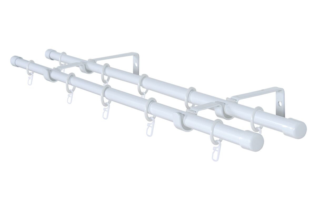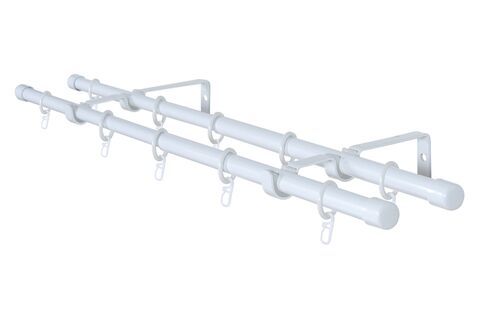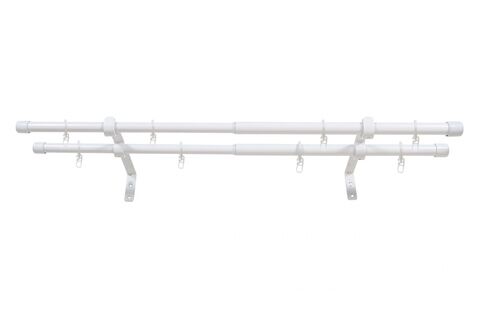 В комплект входят двойные кронштейны, две штанги, кольца и крючки.
