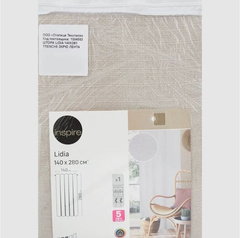 Штора на ленте со скрытыми петлями Inspire Lidia Trench 6 предназначена для приглушения света в жилых помещениях, административных учреждениях. Легко развешивается на карнизе, образуя мягкие волны. Для ухода применяется стирка при 30°C. В упаковке поставляется одно изделие. Безопасный текстиль. Этот товар имеет добровольный экологический сертификат, который гарантирует, что в составе изделия нет вредных для здоровья человека веществ. ### Особенности: - сделана из полиэстера; - дает усадку 2% после стирки; - не вытягивается и не теряет формы; - цвет — экрю; - размеры — 140 х 280 см.