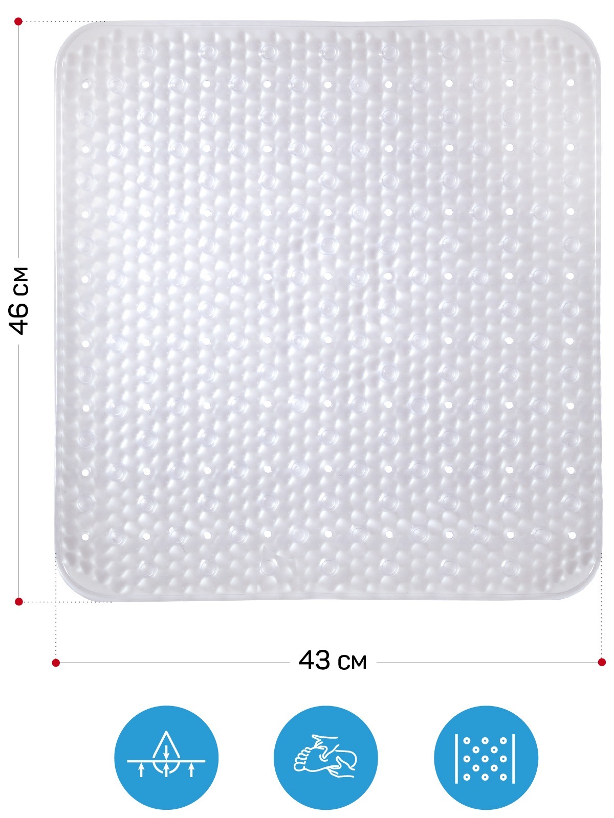 Коврик противоскользящий для ванны и душевой. Сохраняет противоскользящие свойства при контакте с водой, надежно фиксируется на дне ванны за счет присосок. Защищает от холода и скольжения на эмалированной поверхности, обеспечивает комфорт и безопасность. Приятно массирует стопы.