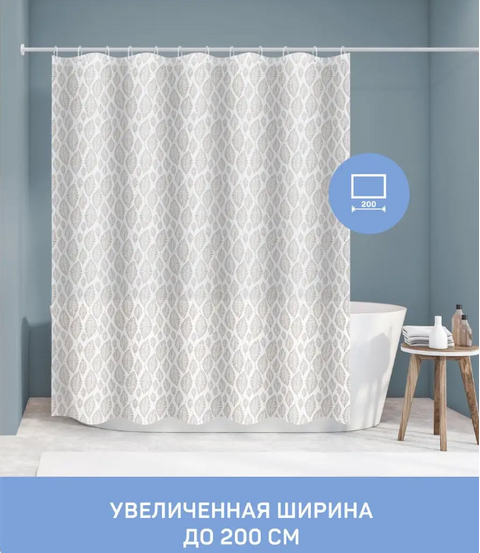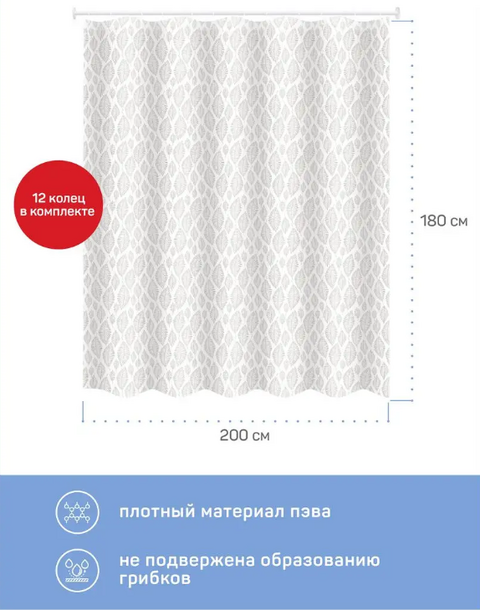 Штора для ванной комнаты отличается современным дизайном, оригинальным четко пропечатанным принтом и качественными материалами. Размер полотна шторы 200*180 см. Увеличенная ширина (200 см) позволит закрыть от брызг ванну. Занавеска для ванной и душа выполнена из гипоаллергенного материала PEVA, полиэтиленвинилацетата. PEVA - это долговечный и прочный материал, который не содержат ПВХ и хлора, следовательно, не пахнет, не выделяет токсичных веществ под воздействием пара и высоких температур. Штора в ванну из PEVA обладает повышенной водостойкостью, не подвержена образованию плесени, не требует сложного ухода. Люверсы из прозрачного полиропилена не проржавеют от воды. Прозрачные кольца из ударопрочного полистирола (12 шт.) входят в комплект. Шторка для ванной комнаты позволяет экспериментировать с интерьером ванной комнаты легко и непринужденно.