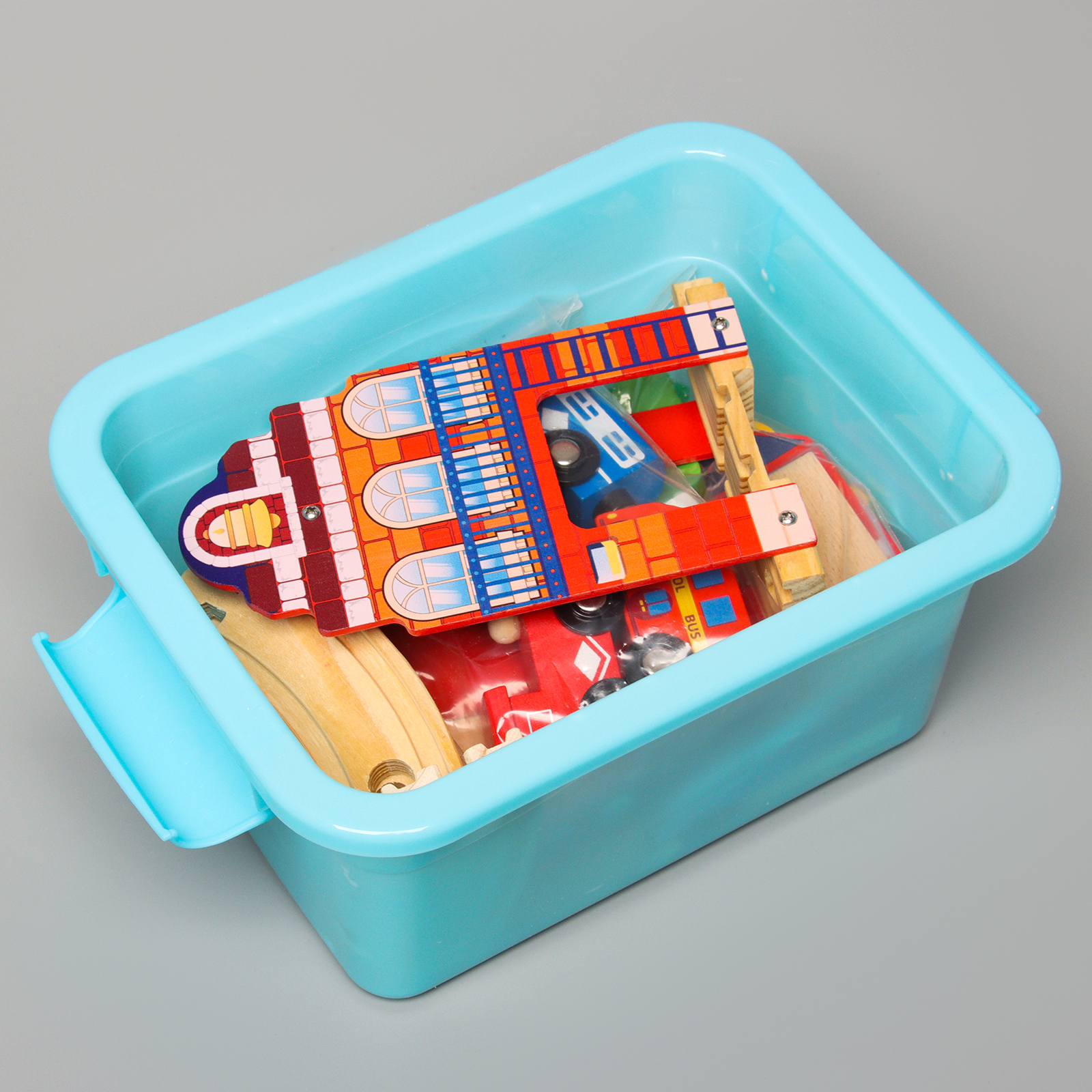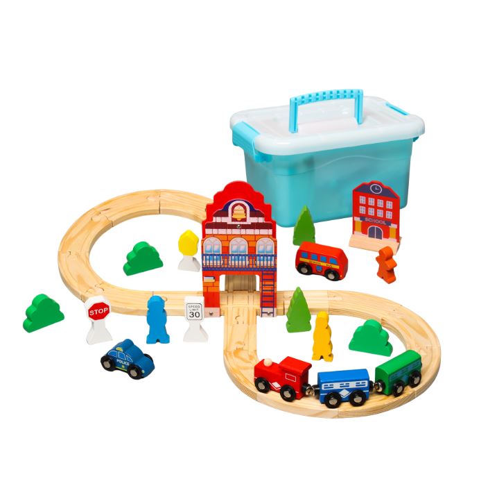 Набор включает в себя 2 вагона и паровоз, рельсы и мост, что позволяет детям создавать различные сценарии движения поездов.