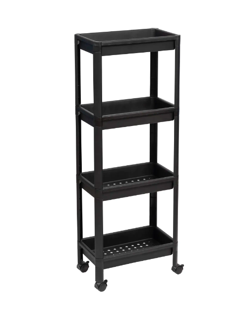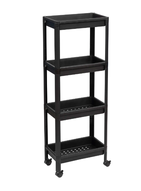 Оснащена колесами, упрощающими перемещение с одного места на другое. Состоит из четыре полок с бортиками, предупреждающими падение размещенных на них предметов. Нижняя часть полок перфорированная, не препятствует стеканию влаги.