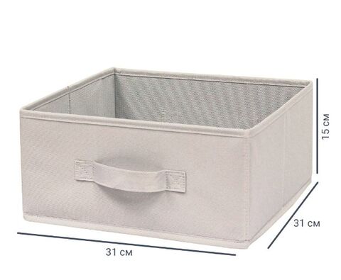 Конструкция компактная, без крышки. При необходимости быстро складывается. Размер изделия 15х31х31 см, объем — 14,4 л. Короб совместим с мебелью серии Spaceo Kub (занимает половину квадратного модуля). Благодаря ручке легко достается с полок. Аксессуар нельзя мыть, уход — сухая чистка. Страна производства товара — Вьетнам.