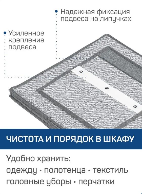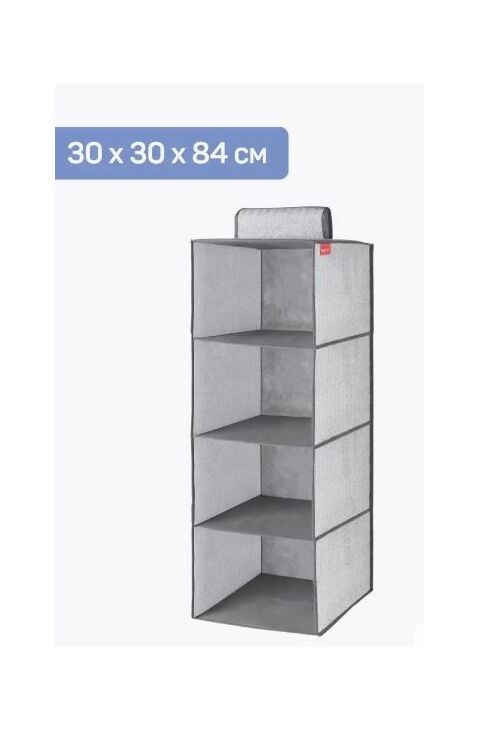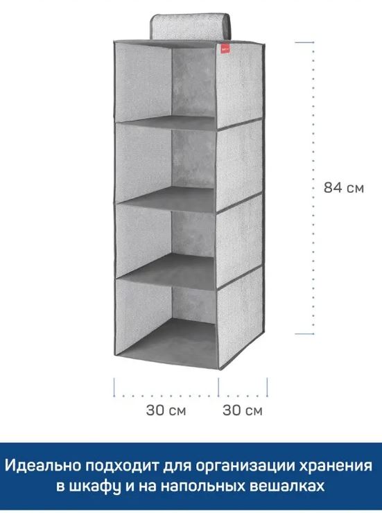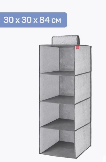 Подвесной органайзер из нетканого материала, 4 вместительные секции, размером 30х30х84 см. Крепится к штанге на застежку-липучку, легко перемещается. Верхняя часть и дно укреплены картонной вставкой. К органайзеру идеально подойдет короб без крышки из коллекции 29х29х18 см. Стильное и удобное хранение в современном интерьере