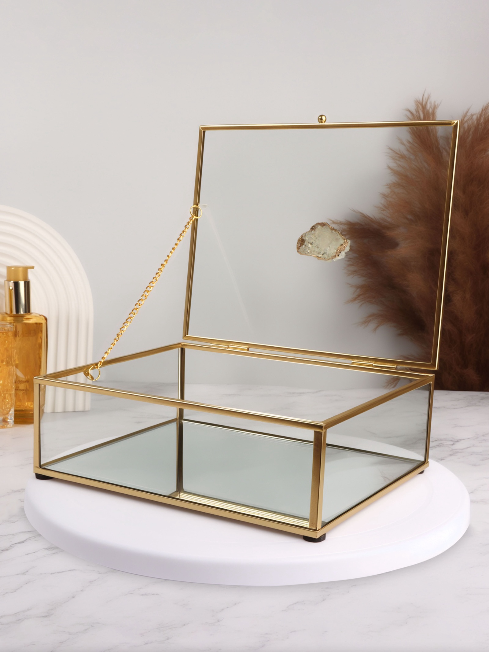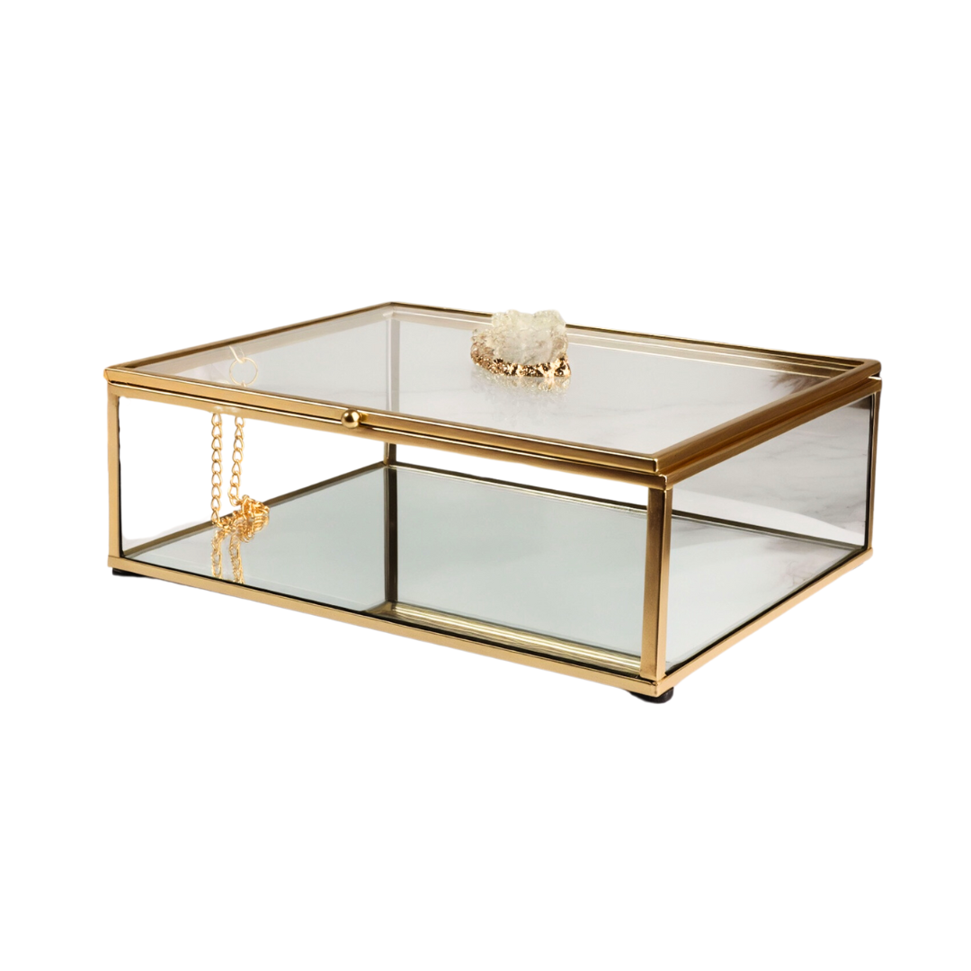Этот изящный органайзер для хранения «MOUNTAINS» от Queen Fair станет стильным решением для упорядочивания косметики и мелких предметов на вашем туалетном столике. Его элегантный дизайн объединяет прозрачное стекло и медные элементы, создавая гармоничное сочетание классики и современности. Органайзер оснащён плотной крышкой, что обеспечивает защиту ваших вещей от пыли и поддерживает порядок.