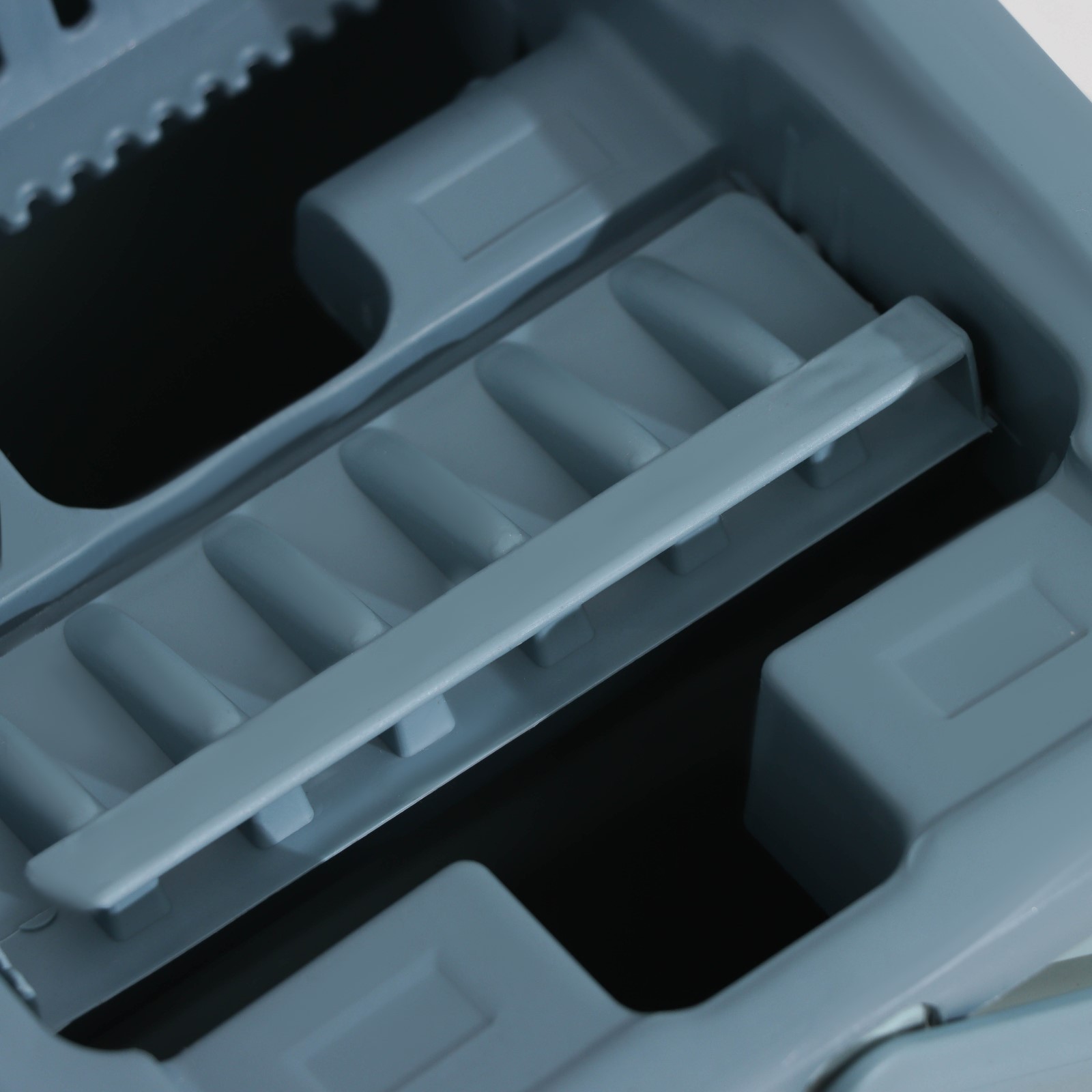 Продуманная конструкция: ведро с двумя отсеками для полоскания и отжима позволяет эффективно использовать воду и минимизировать усилия при отжиме насадки.