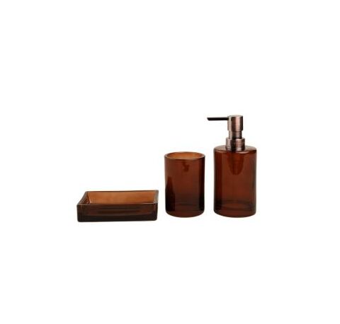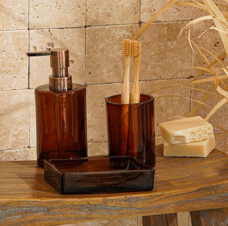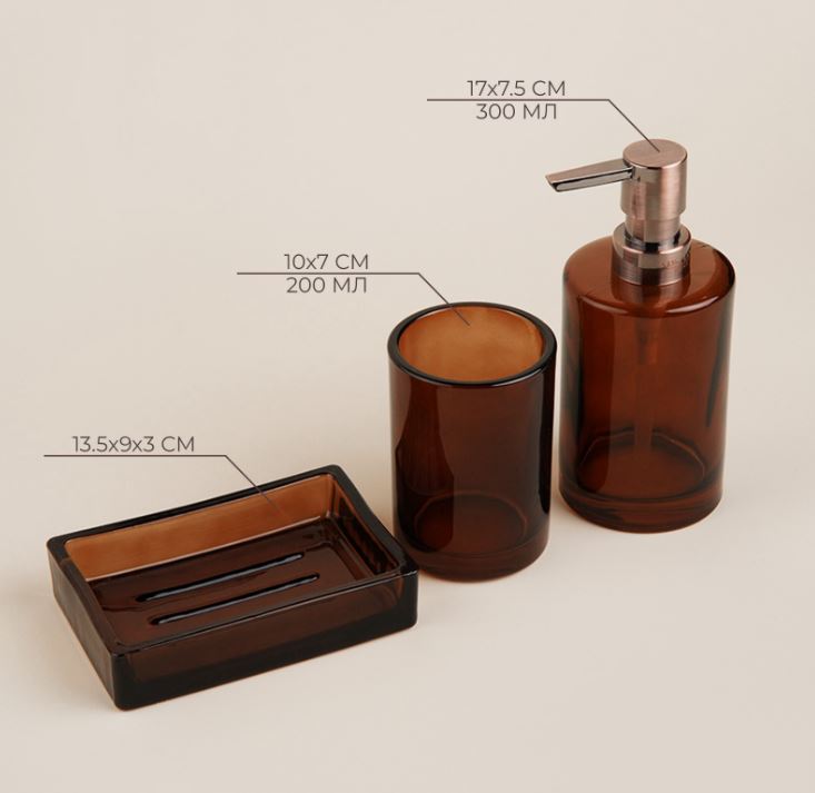Выполненные из высококачественного стекла в утончённых коричневых и прозрачных оттенках, элементы набора подчеркнут изысканность вашего интерьера. Один из главных плюсов — оптимальный объём дозатора в 300 мл, что обеспечивает удобство использования и позволяет долго наслаждаться его функциональностью.