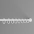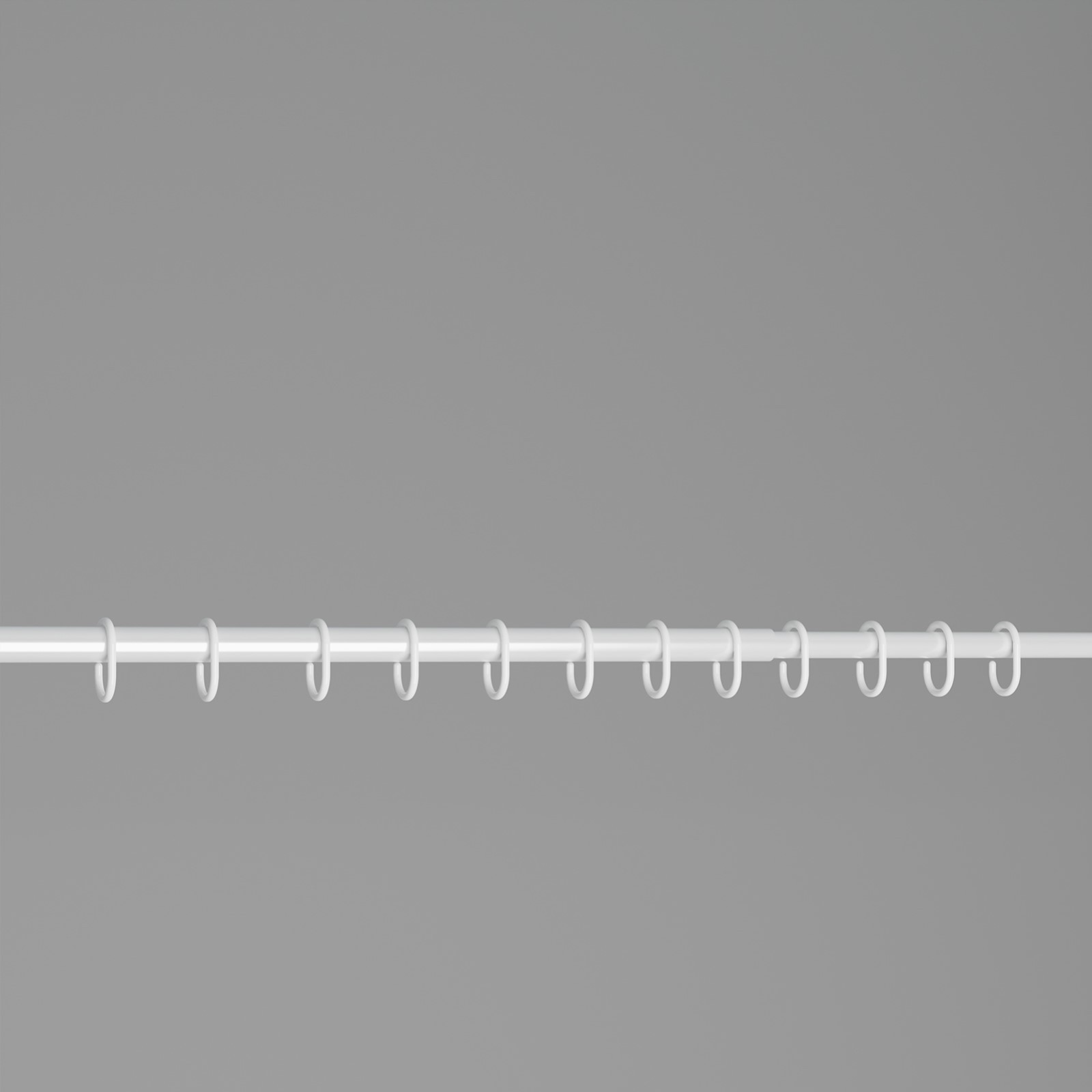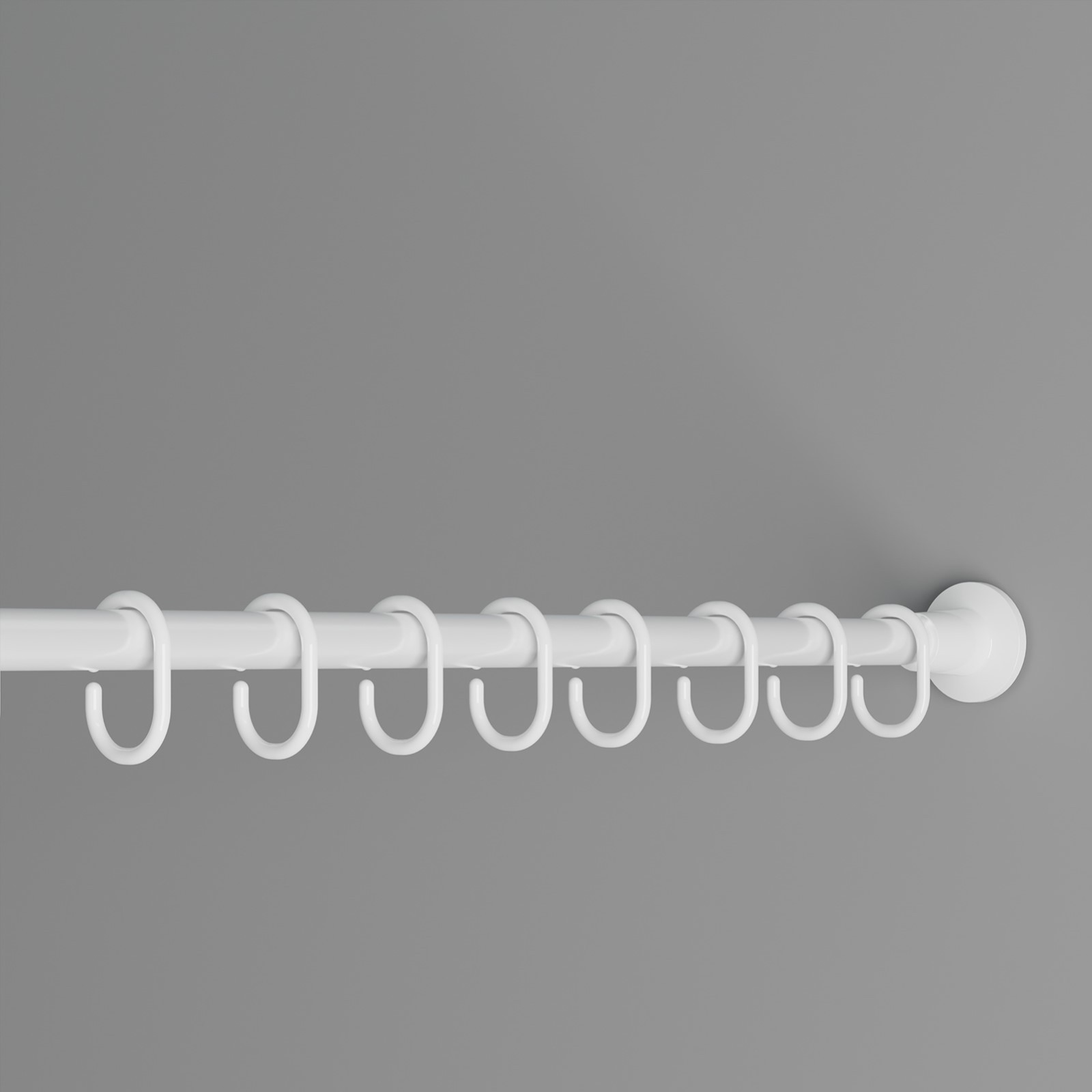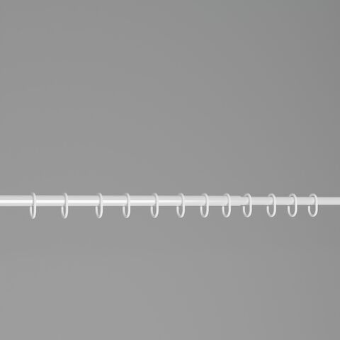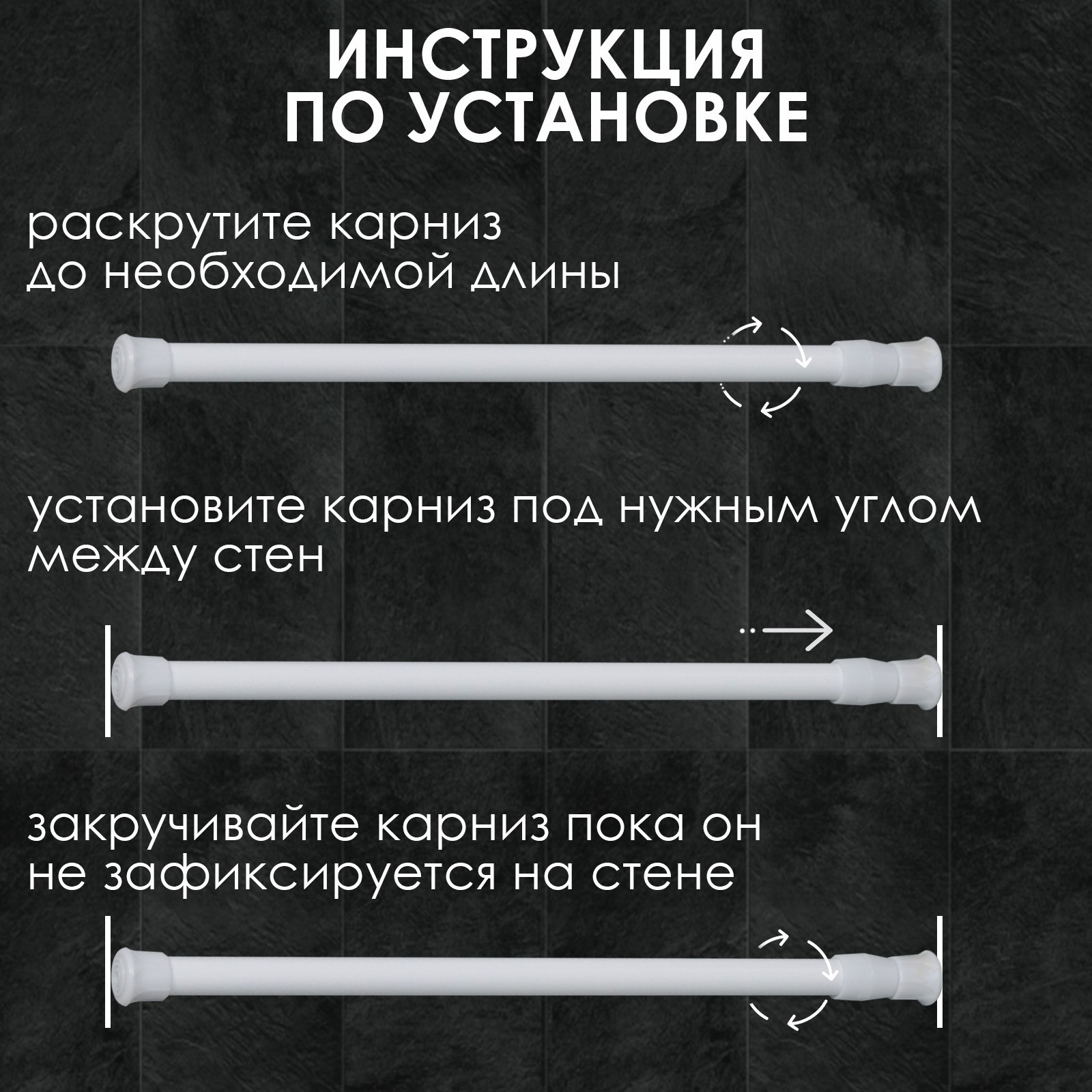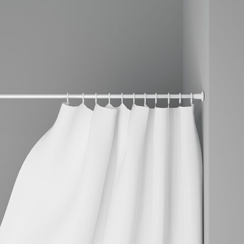 Металлический карниз работает по следующему принципу. Вы устанавливаете его одной стороной в стену и раскручиваете с другой. Так он увеличивается до 220 см. После того как второй край упрётся, следует сделать ещё 2–3 оборота для более надёжной фиксации. Затем просто навесьте штору с крючками и распрямите её по всей длине.